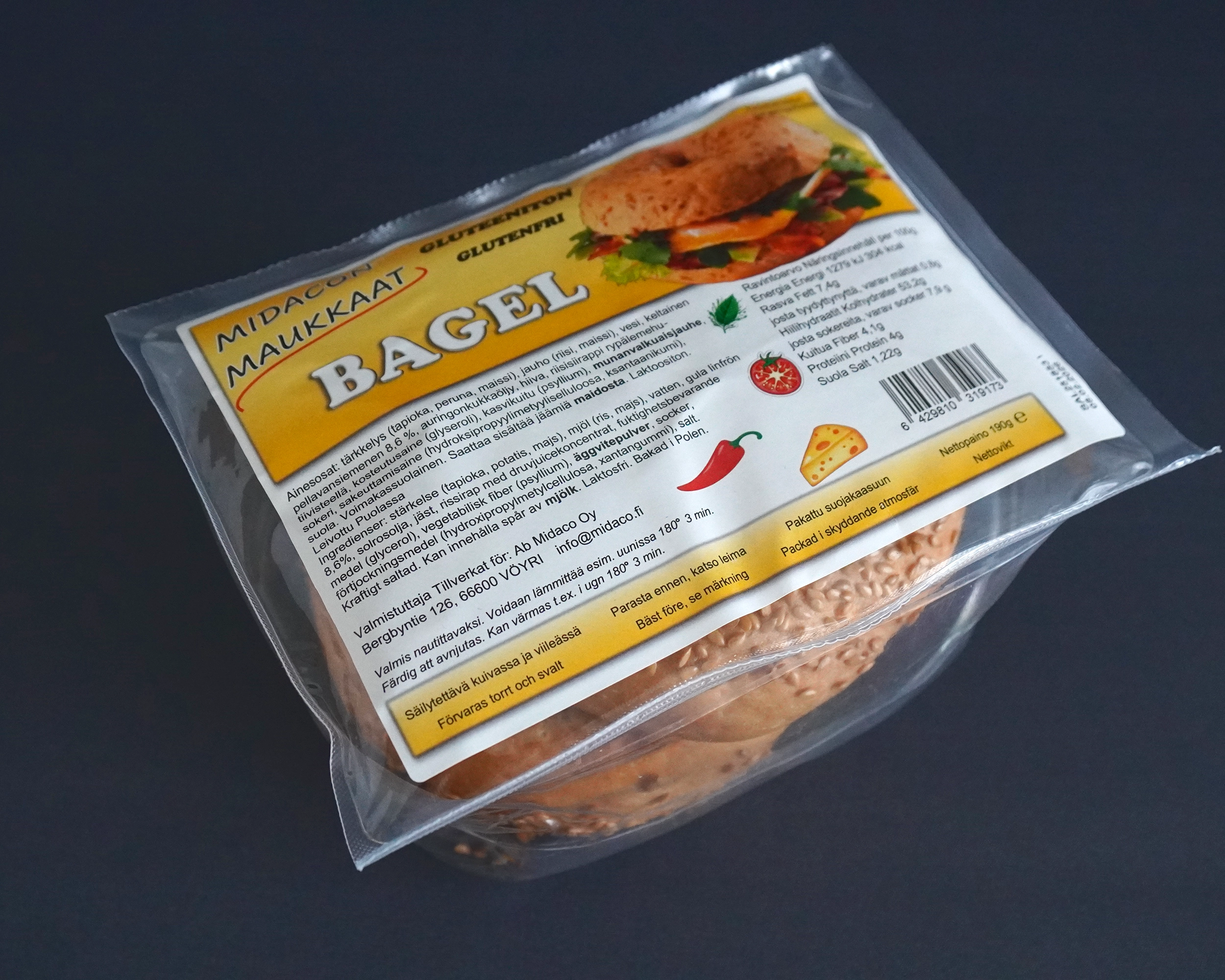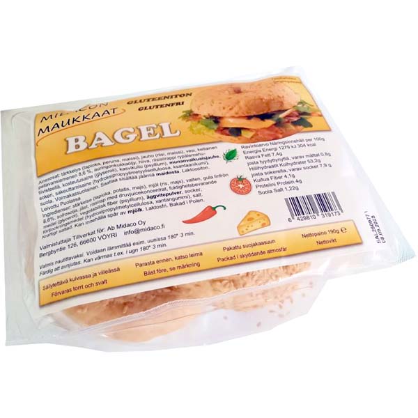 Suosittu gluteeniton ja maidoton bagel, pinnalla rapeita pellavansiemeniä.