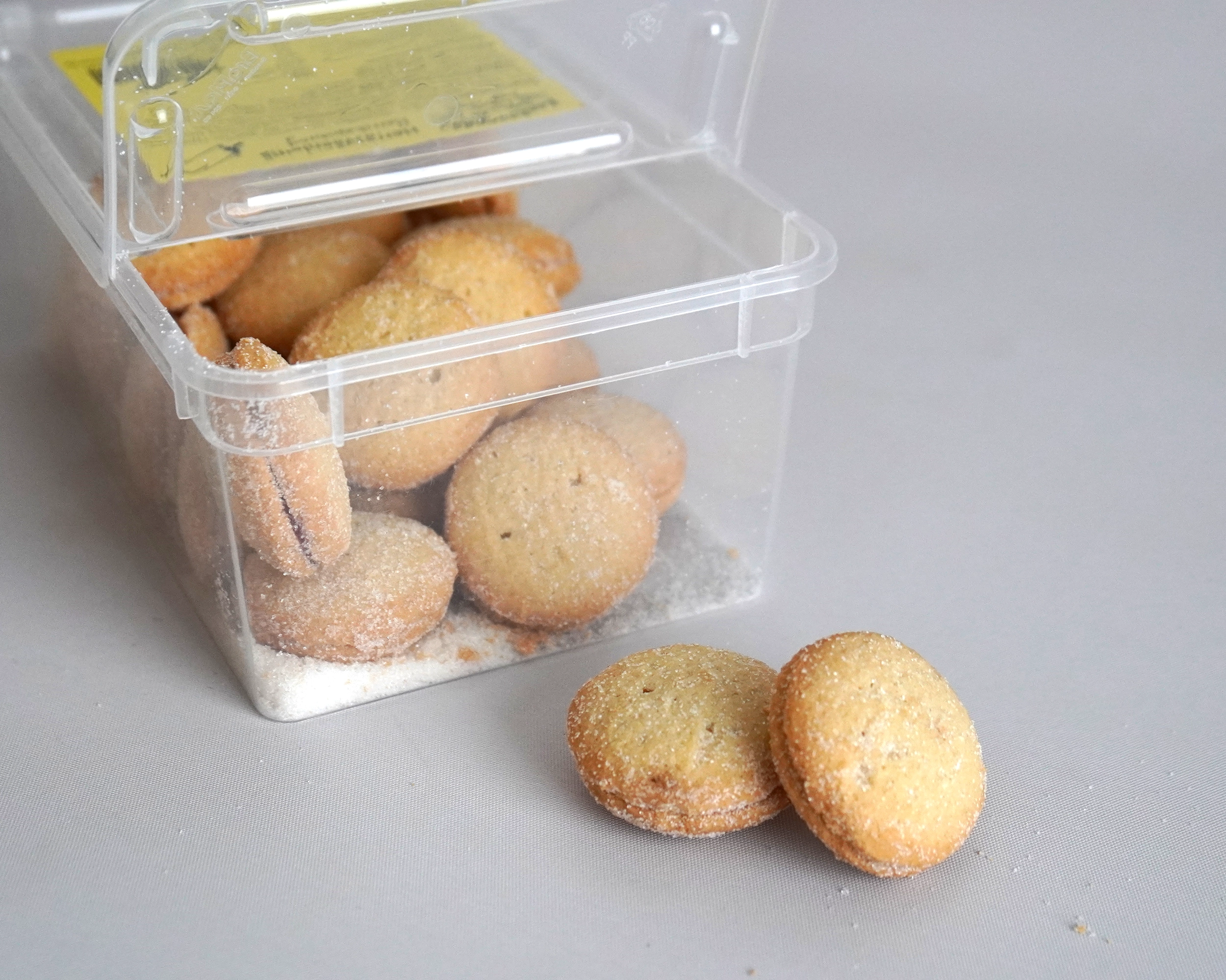 VEHNÄJAUHO, laktoositon margariini (palmu, rypsi, kookos), sokeri, laktoositon voi, KANANMUNA, nostatusaine leivinjauhe ja sooda (E450, E500), vaniljasokeri, vadelma-omenahillo