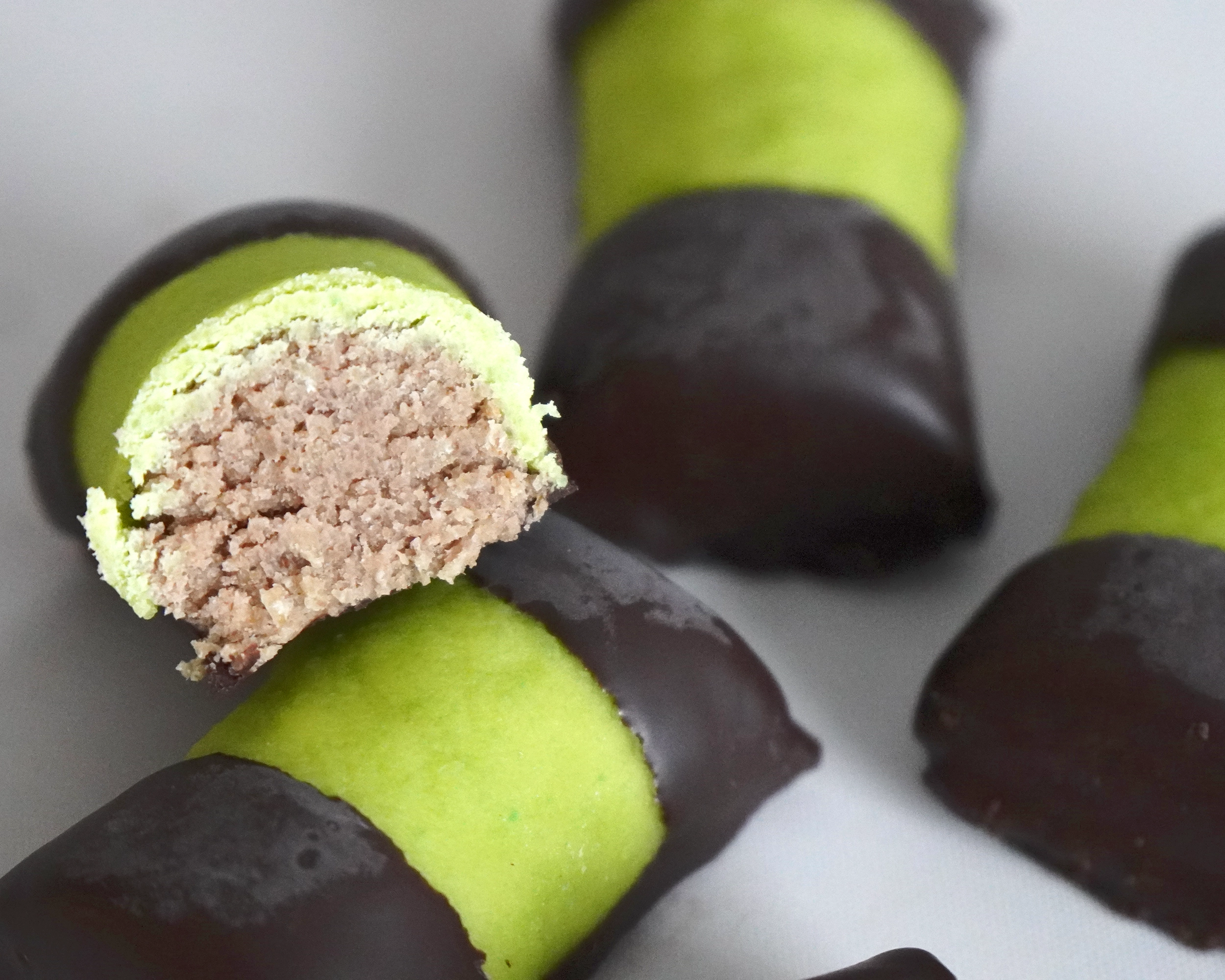 Punssinmakuinen, marsipaanilla päällystetty leivos kaakaokuorrutteella.